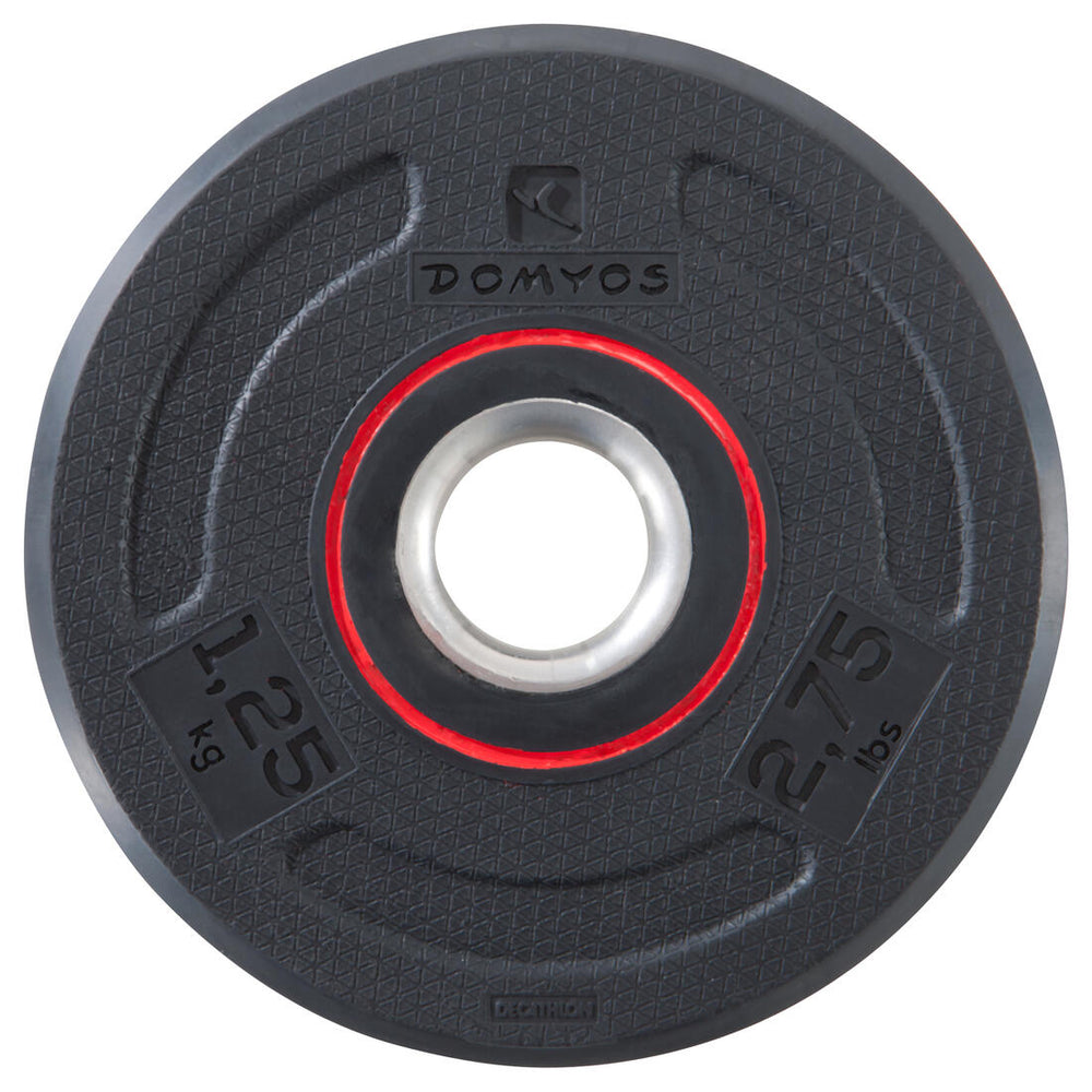 Disco de musculación de 1,25 kg con revestimiento de goma para absorber los impactos. Se vende por unidades para que puedas adaptar la carga a tus necesidades.