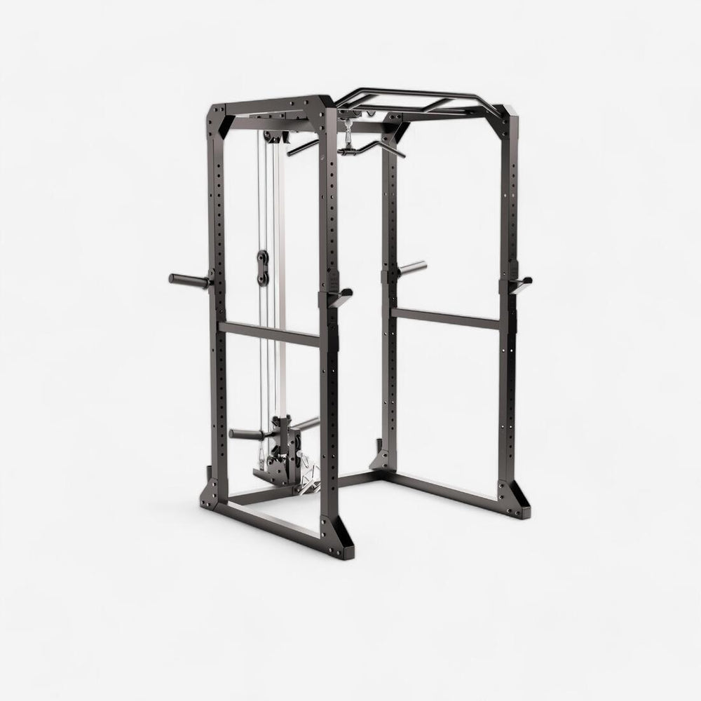 Con este rack se incluye: - Una polea integrada no desmontable (100 kg máx., posición baja o alta) - 2 empuñaduras de tracción (1 triángulo y 1 barra) - 2 soportes para discos (máx. 100 kg cada uno) y 2 reposabarras, para que tu espacio de musculación sea fácil de organizar. - Un adaptador que permite adaptar los soportes para discos y el reposabarras al diámetro de tu equipo: 28 mm o 50 mm. - Además puede instalarse de dos formas diferentes para ofrecerte un agarre extendido.